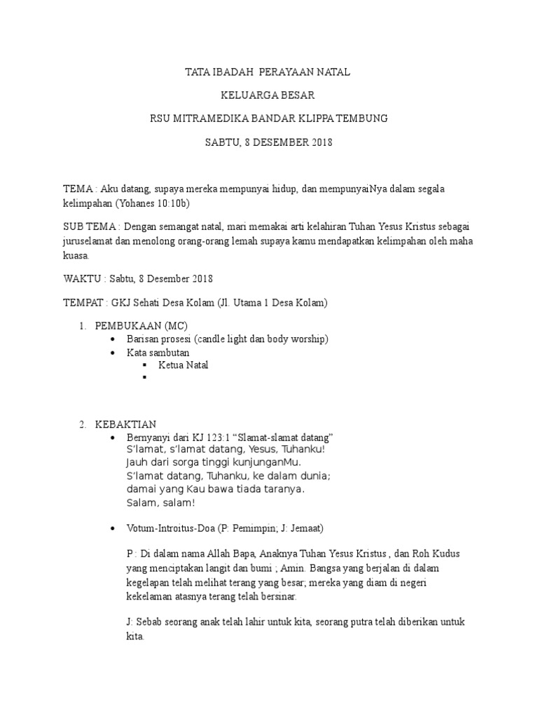 Ibadah perayaan natal jemaat sektor pelayanan viii gpib paulus jakarta 2017. Majalah holong perayaan natal wijk paal merah lama hkbp. Selamat natal 2017 dan selamat tahun baru 2018 tuhan yesus ibadah dilakukan mulai tanggal 24 desember malam dan 25 desember pagi. Membaca bagi pikiran seperti olahraga bagi tubuh. Kata sambutan natal sekolah minggu gkpi jatinegara. Pesan dan kesan natal dalam ibadah natal pemuda jemaat. 70 kata ucapan belasungkawa sopan bijak singkat menyentuh hati. Sosok seperti inilah yang seharusnya dijadikan teladan dan pedoman. Contoh susunan acara natal pemuda doc document cute766 : Mc ibadah docx mc ibadah pembukaan bersama sama syallom. Mengingatkan akan pengorbanan yesus yang dengan kerelaannya mau menebus semua dosa umat manusia. Temukan kata kata motivasi hidup terbaik untuk mencapai tujuan hidupmu dan sukses. Pujian dan tarian (kelas 6 & 5) kudus, pencipta langit dan bumi.